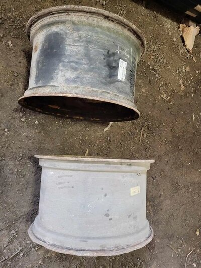 50%, weathered, small cracking in sidewall, 12 bolt, 14 5/8" pilot, black centre's on silver waffle rims Stock #...