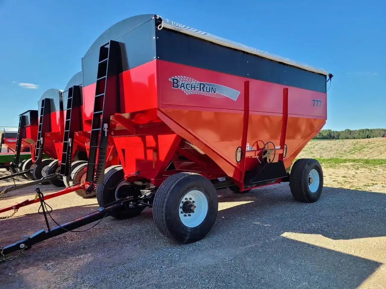 800 bu., 25T, hydraulic drum brakes on 2 wheels, Sulock-style roll-up tarp, LED lights, new tires 445/65R22.5, the box rests on 8 rubber springs, spring equalizer, safety chain and SMV sign. Available in red, green, black, blue, orange and yellow