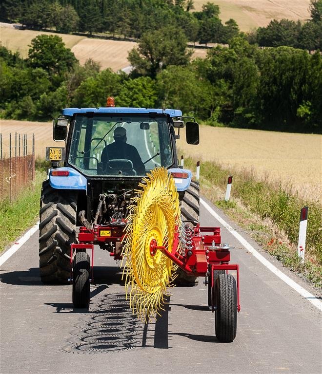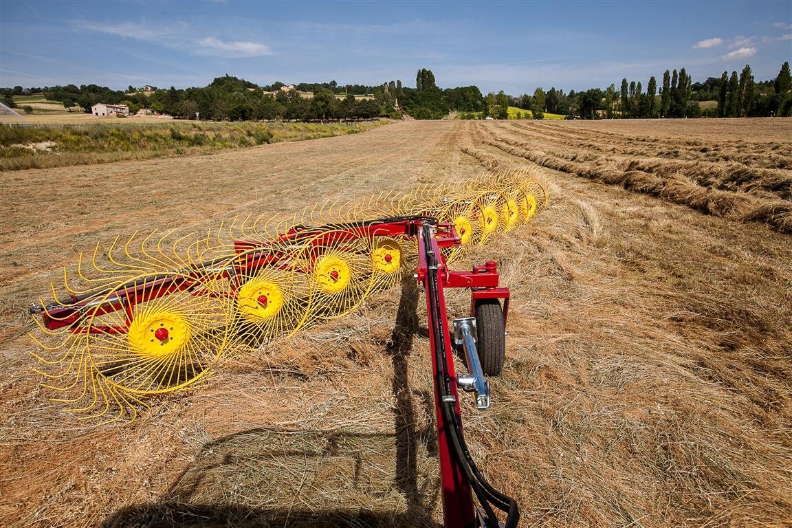 The machine can be brought from the transport position to the working position (and vice versa) by simply moving a hydraulic control from the tractor cab. This is because the machine is equipped with a joint system that makes it possible to minimize the overall dimensions of the machine during transport and to be able to constantly adjust the working width, adapting it to your needs. Block valves on the opening and closing cylinders allow you to transport the machine safely and to maintain the same working width while raking.