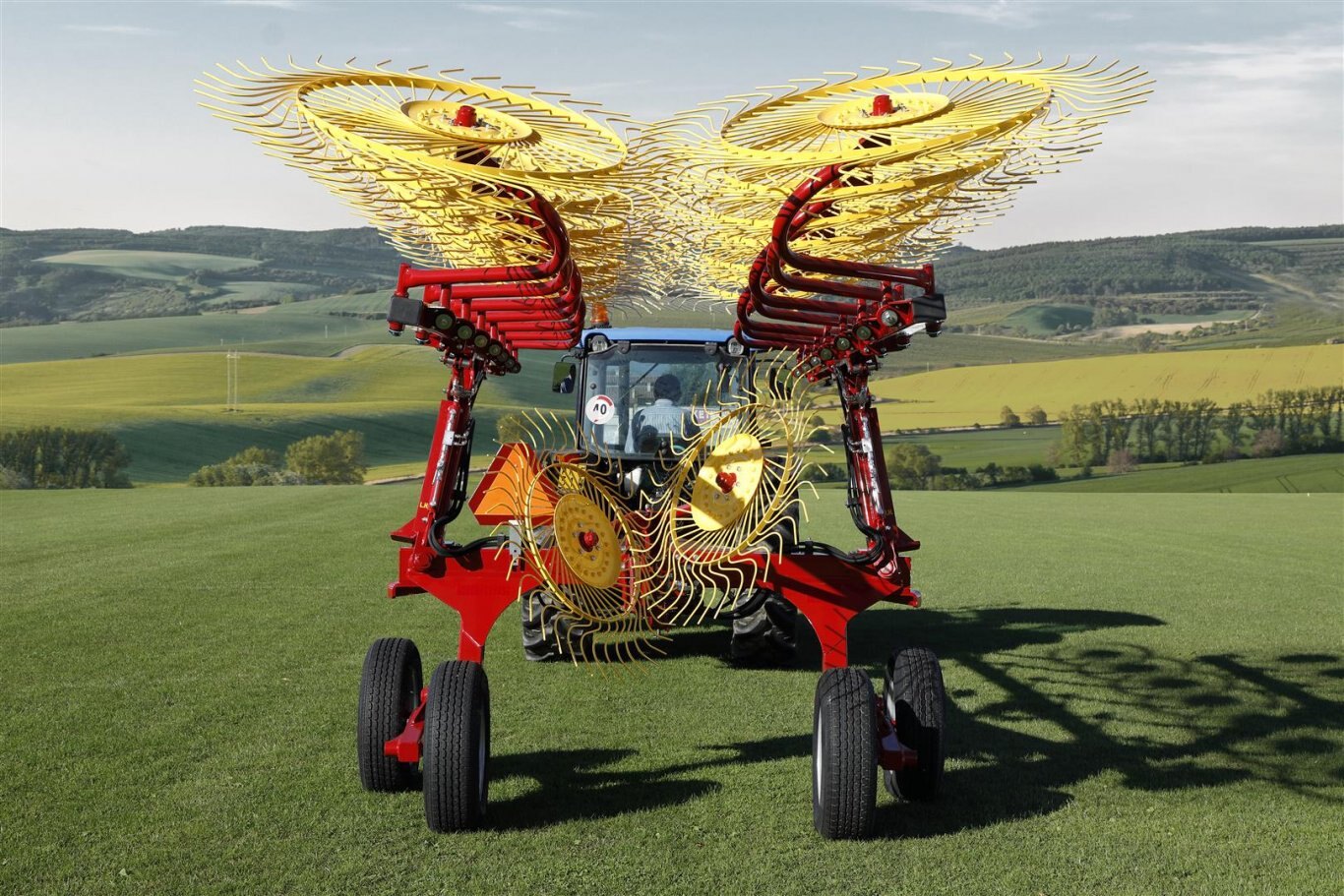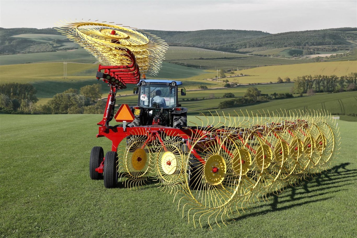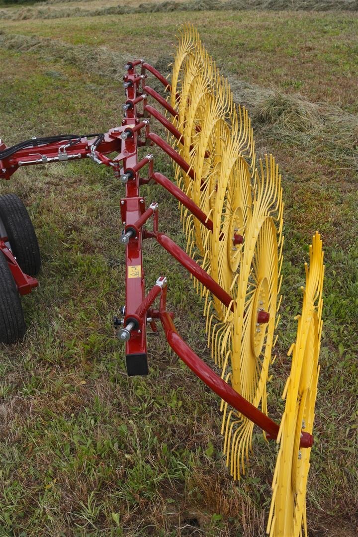 The standard version has rake wheels with a diameter of 55” (1.4m) and tines with a diameter of 0.28” (7mm). As an alternative, and with no changes to the machine structure needed, it is possible to mount optional rake wheels with a diameter of 60’’ (1.52m) and tines with a diameter of 0.3” (7.5 mm). Each wheel, regardless of the diameter, is equipped with 40 tines made of top-quality spring steel.The machine can be brought from the transport position with the rake arms raised, parallel to the ground and with each other, to the position with the arms lowered and already angled correctly for working (and vice versa) by simply moving a hydraulic control from the tractor cab. This is because the machine is equipped with a special joint system that rotates on two suitably inclined axes. Thanks to this system, it is possible to reduce the overall dimensions of the machine and make it more stable.