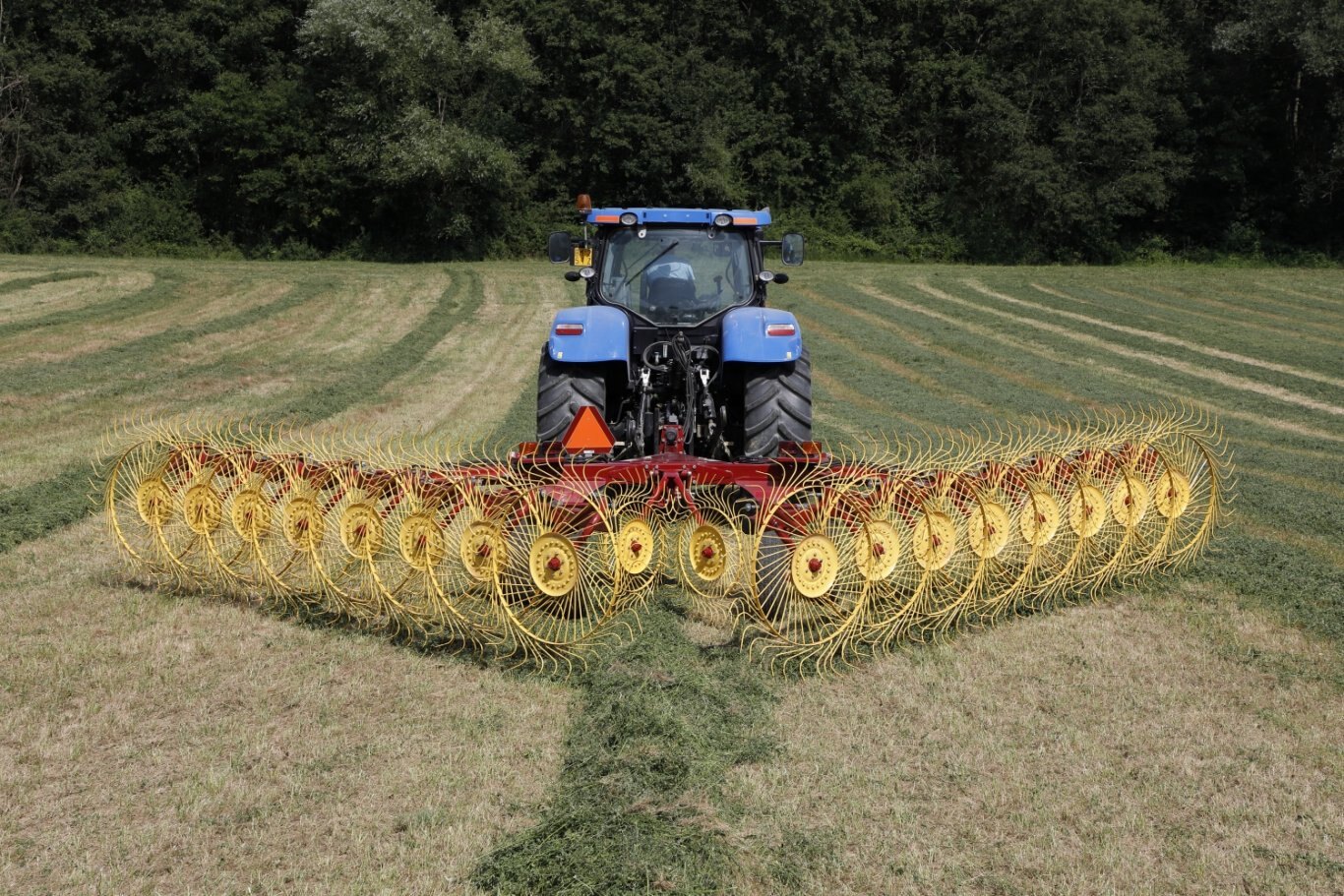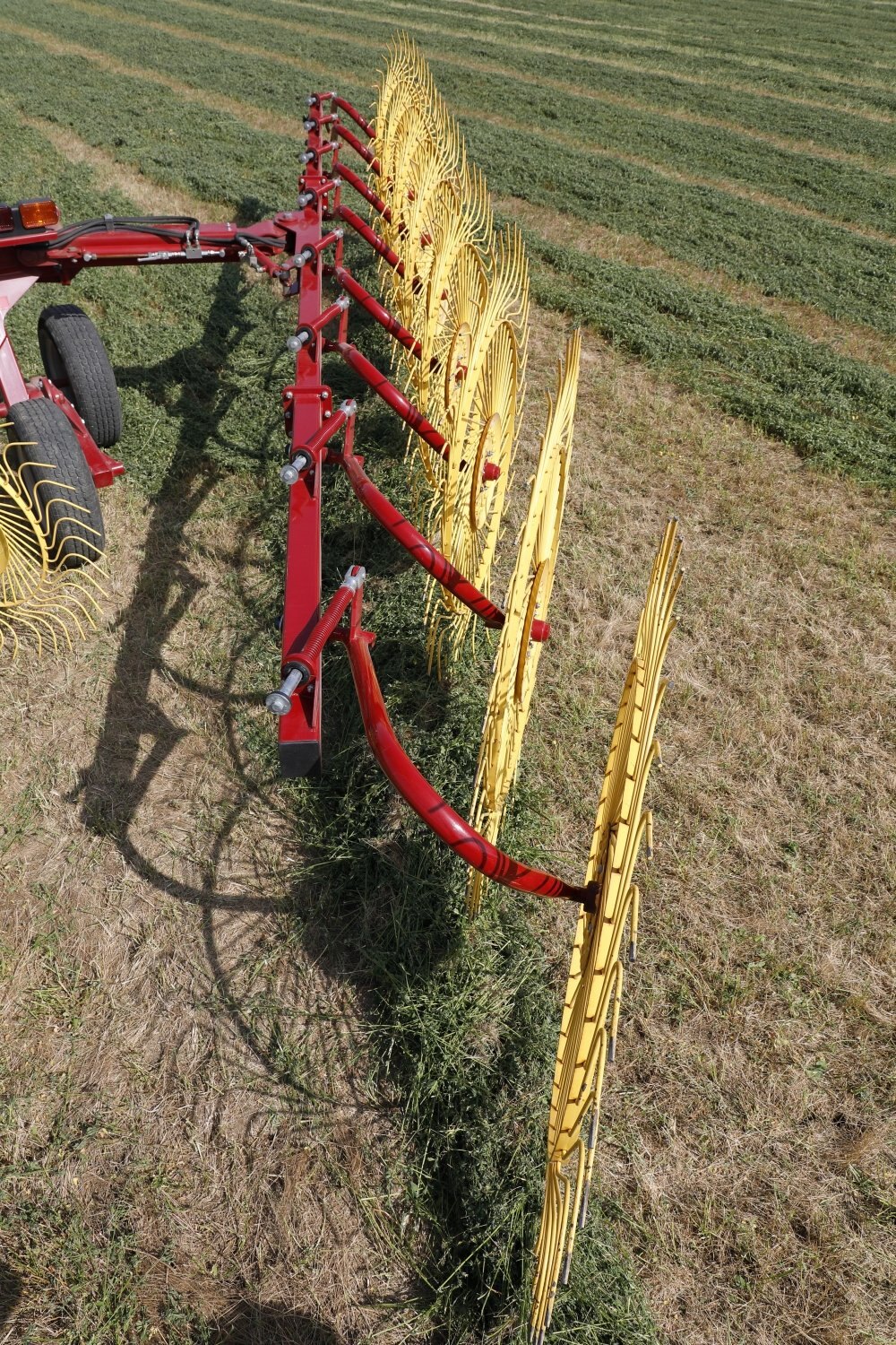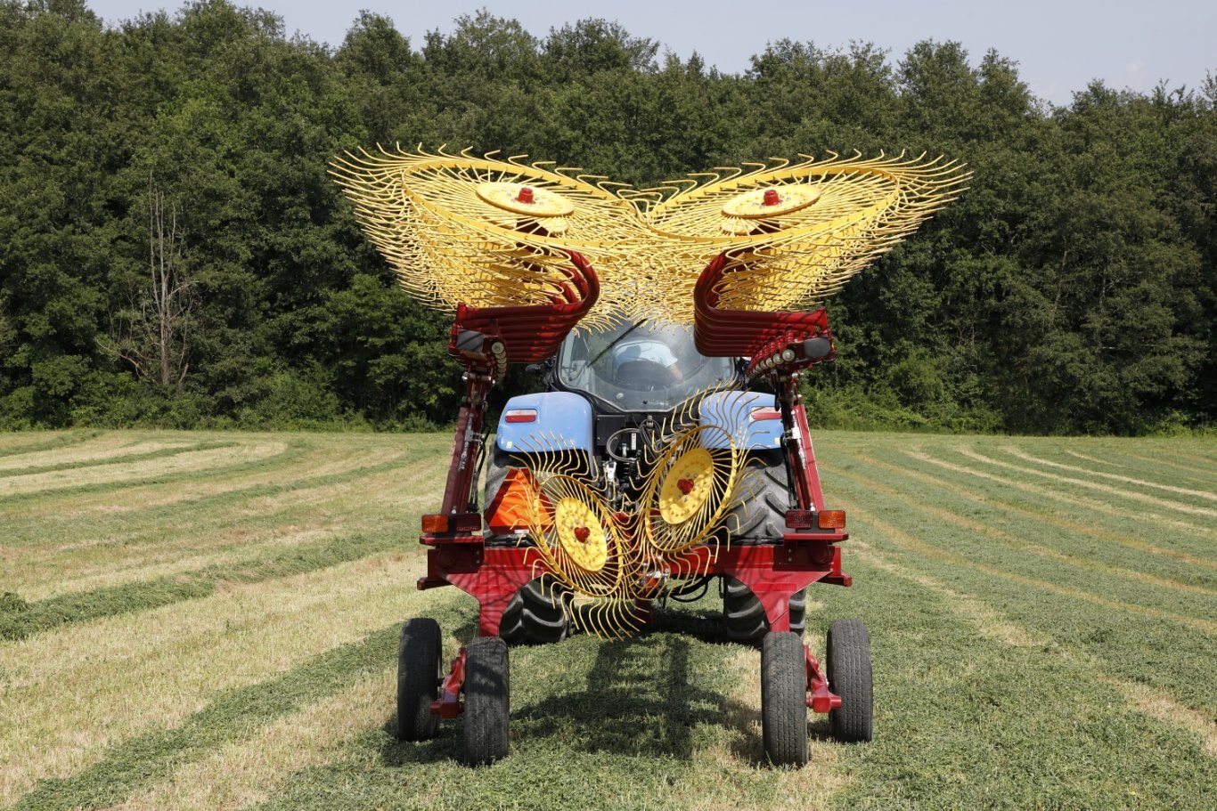The standard version has rake wheels with a diameter of 55” (1.4m) and tines with a diameter of 0.28” (7mm). As an alternative, and with no changes to the machine structure needed, it is possible to mount optional rake wheels with a diameter of 60’’ (1.52m) and tines with a diameter of 0.3” (7.5 mm). Each wheel, regardless of the diameter, is equipped with 40 tines made of top-quality spring steel.The machine can be brought from the transport position with the rake arms raised, parallel to the ground and with each other, to the position with the arms lowered and already angled correctly for working (and vice versa) by simply moving a hydraulic control from the tractor cab. This is because the machine is equipped with a special joint system that rotates on two suitably inclined axes. Thanks to this system, it is possible to reduce the overall dimensions of the machine and make it more stable.