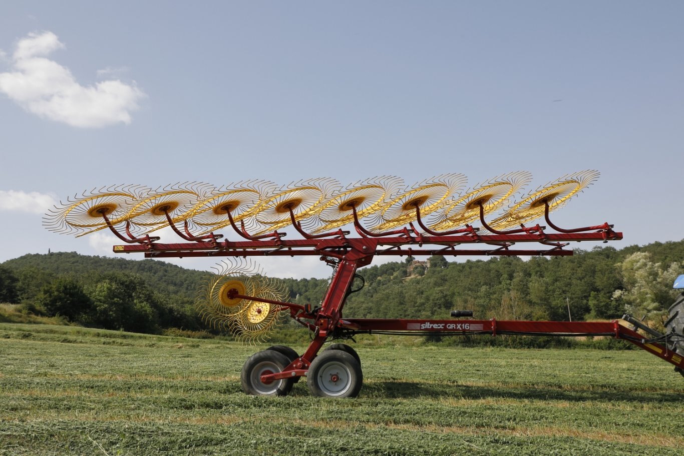 The new QRX range of "V" type wheel rakes with 12,14 or 16 wheels are easy to use machines that have a strong frame and therefore are able to provide excellent performance as regards both quantity and quality. Although very compact, and thus able to guarantee great maneuverability in narrow spaces and over irregular ground, and at the same time excellent quality work and great stability both while working and during transport, they have a variety of systems and devices that make them comparable to higher range machines in terms of performance, but with lower operating costs.