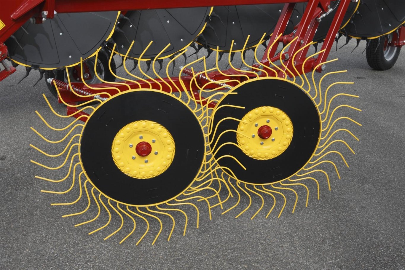 Raking wheels float independently from one another. Therefore each one moves following the ground contours for cleaner raking compared to raking wheels mounted in tandem. Each wheel is suspended on a spring and can be adjusted individually for optimum ground contact pressure (left). Once adjusted, a single pin adjusts the working height of all the raking wheels on that side of the rake (right).