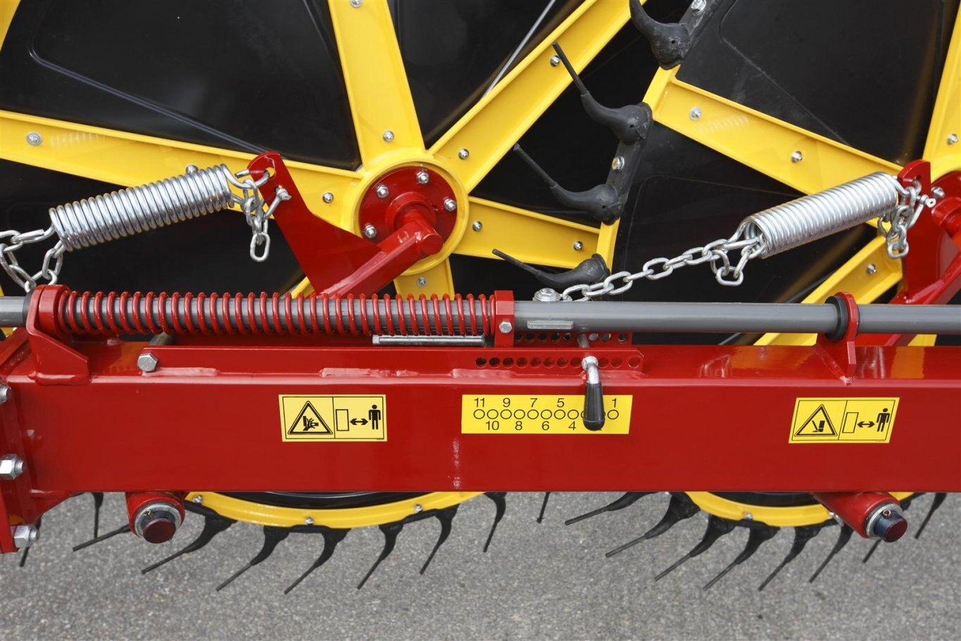 Raking wheels float independently from one another. Therefore each one moves following the ground contours for cleaner raking compared to raking wheels mounted in tandem. Each wheel is suspended on a spring and can be adjusted individually for optimum ground contact pressure (left). Once adjusted, a single pin adjusts the working height of all the raking wheels on that side of the rake (right).