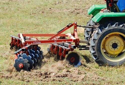 The front and rear frame of the Athens 37 is constructed of angle and steel tubing, welded into a unitized assembly for strength and durability.  The rear frame can be pinned in the up position to increase the weight on the front gangs for the initial pass.