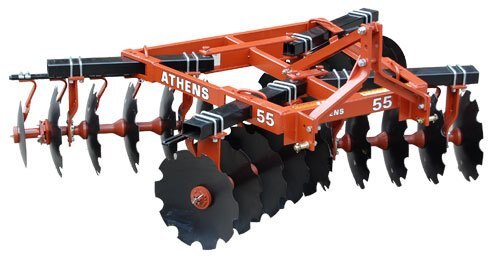 The front and rear frame of the Athens 37 is constructed of angle and steel tubing, welded into a unitized assembly for strength and durability.  The rear frame can be pinned in the up position to increase the weight on the front gangs for the initial pass.