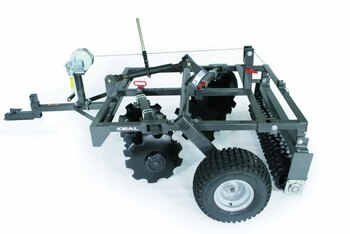 Ideal Equipment's UTV Disc Harrow is one of the most useful garden implements you'll ever own. Perfect for tilling the soil for a garden, or to chop up unwanted weeds and old crops, this disc harrow attaches to UTVs, ATVs and small tractors with a simple 2" ball hookup. The 16" blades are adjustable and cut deep even in tough soil. You'll have four feet of cutting width, and can easily adjust the wheel height with a two-way ratchet. Whether you're landscaping, gardening or working on a wild game plot, the 13 inch 4-ply tubeless tires give you ground clearance and drag as needed. This is a super heavy-duty disc harrow with sealed bearings and a corrosion-resistant finish.