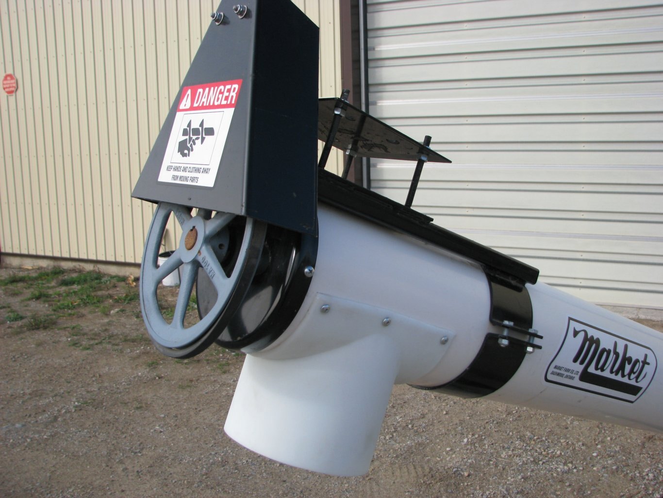 The Market Transfer Auger is ideal for high moisture corn. It was originally designed to fill auger legs and blowers where tight fits are a problem. The tube is a heavy gauge PVC with a polyethylene spout and fill hopper. Available in 12' lengths. Maximum discharge height is 60". Either electric or hydraulic kits are available The tube is a heavy gauge PVC with a polyethylene spout and fill hopper. Available in 12' lengths. Maximum discharge height is 60". Either electric or hydraulic kits are available. |