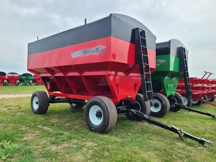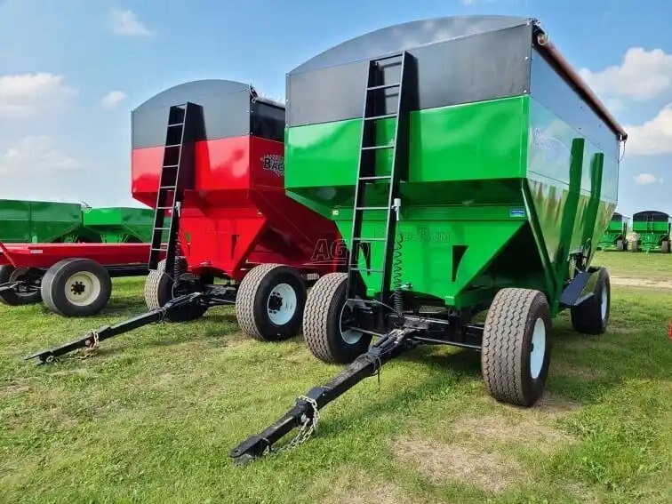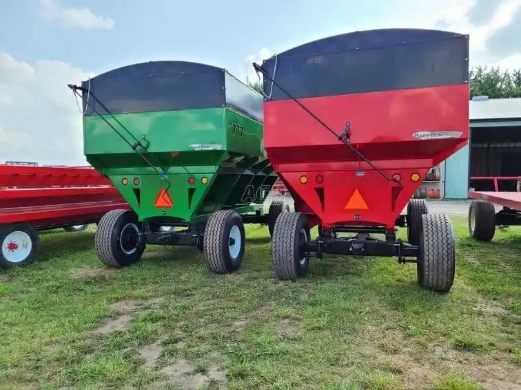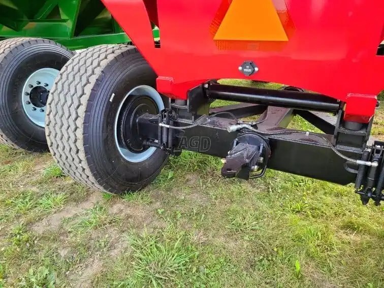 800 bu., 25T, hydraulic drum brakes on 2 wheels, Sulock-style roll-up tarp, LED lights, new tires 445/65R22.5, the box rests on 8 rubber springs, spring equalizer, safety chain and SMV sign. Available in red, green, black, blue, orange and yellow