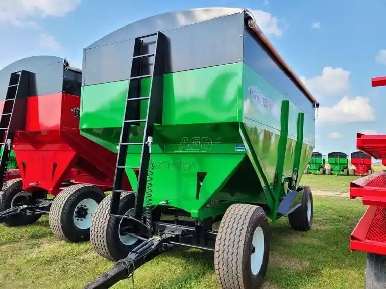 800 bu., 25T, hydraulic drum brakes on 2 wheels, Sulock-style roll-up tarp, LED lights, new tires 445/65R22.5, the box rests on 8 rubber springs, spring equalizer, safety chain and SMV sign. Available in red, green, black, blue, orange and yellow