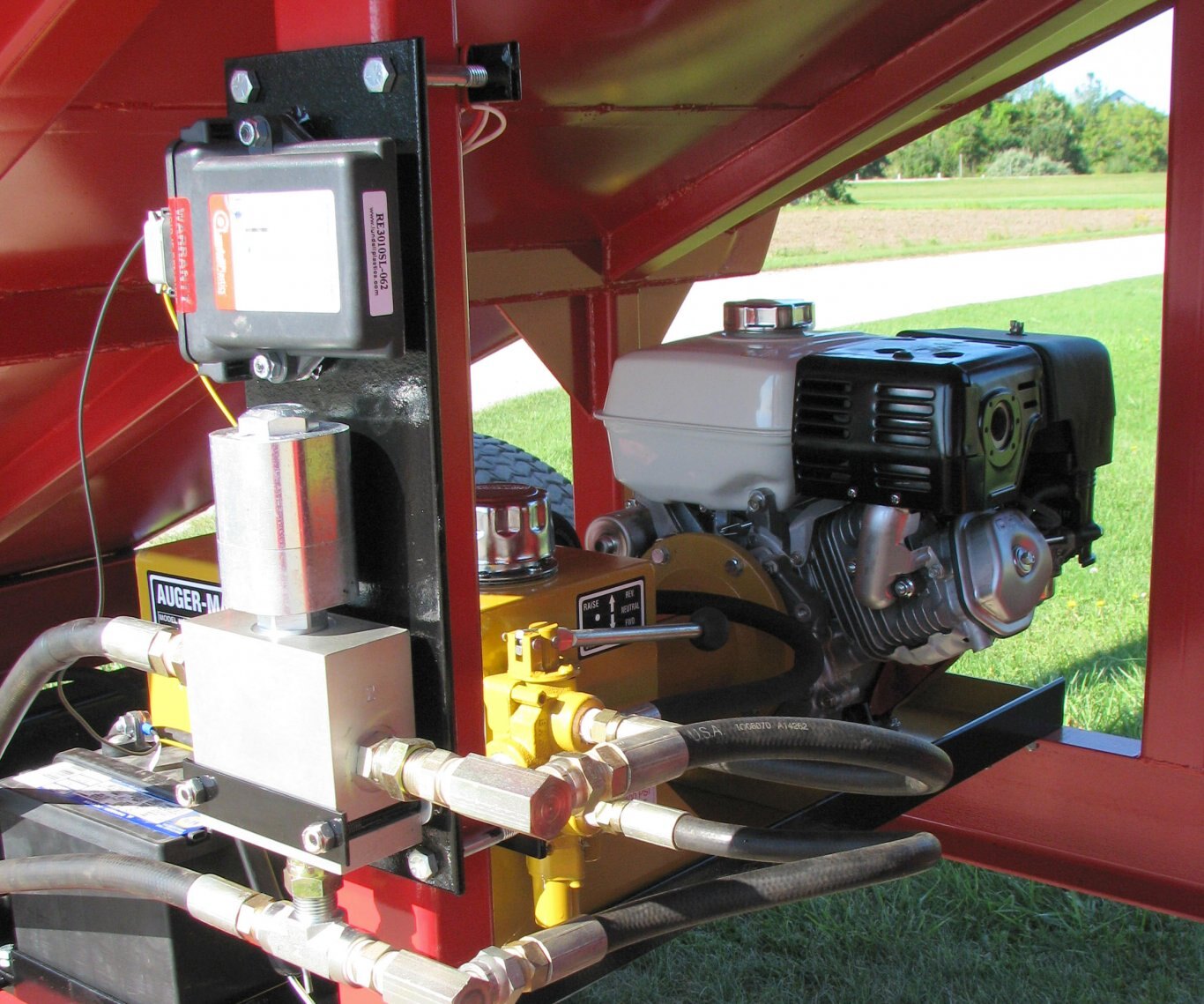 8 Hp. engine for plenty of power in a compact package. 13 Hp. Honda engine also available. Oversized 5 gallon fluid reservoir Designed to match auger for best efficiency. Powers auger at ideal speed to minimize seed damage. Mounted on rear of gravity box for easy access. |